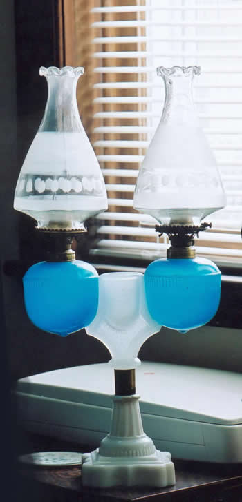 This is called a wedding lamp. It was made around 1879 by Ripley & Co. in the United States. The two matching chimneys substantially increase the value of this highly collectible lamp. The lamp alone is worth about $1,200. With the matching chimneys, it’s worth about $1,800.