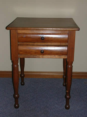 This is a two drawer work table that appears to be mostly walnut. It was probably made in southwestern Ontario about 1860. The curved drawers are an Empire feature and a bit unusual and two drawers are certainly rarer than one. Even though this table has apparently been refinished, it should still be worth $750.